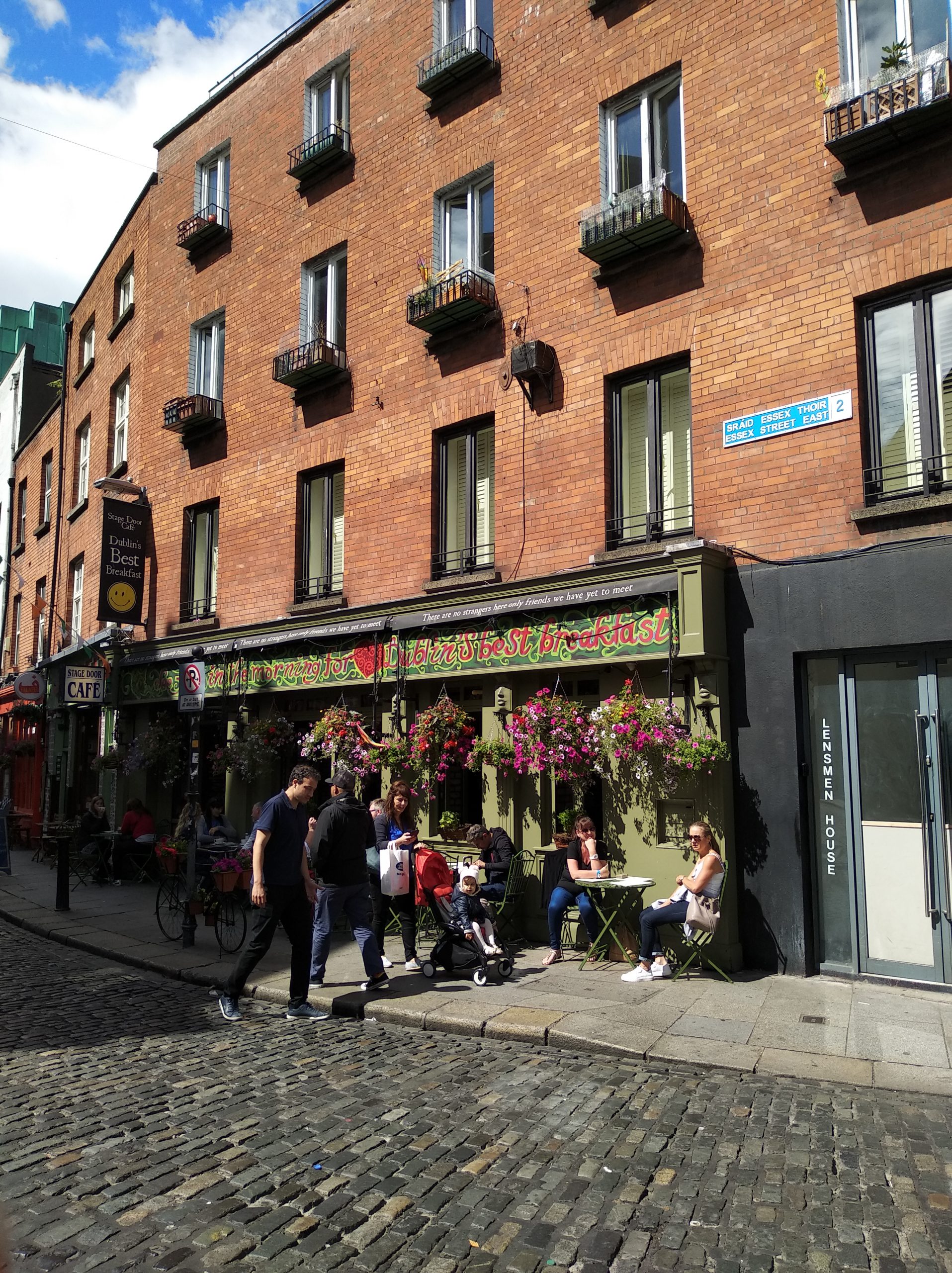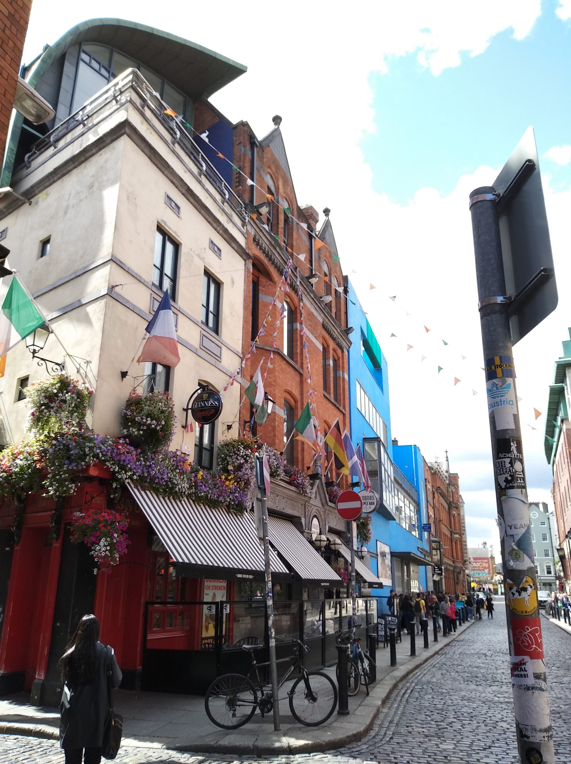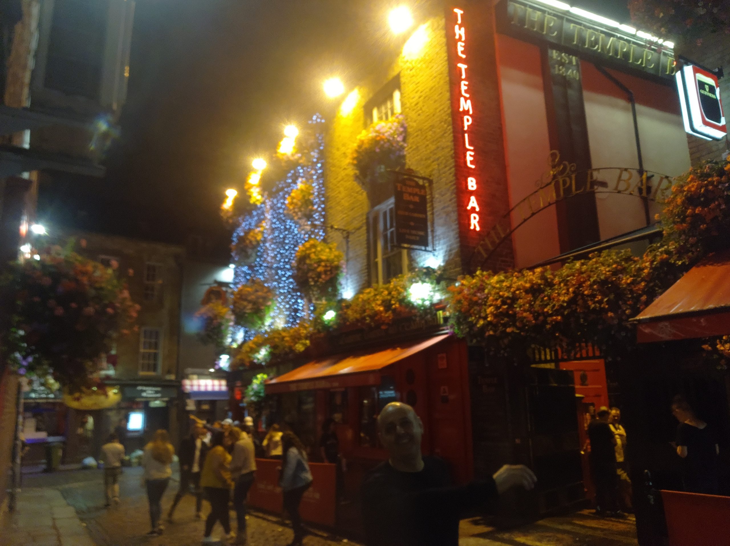 Nos alojamos en este barrio, en pleno centro y la zona más turísristica. Quizás lo más conocido es el bar del mismo nombre y nos lleva a pensar que el barrio toma el nombre de dicho bar, pero no es así, es un curioso doble sentido de traducción del irlandés, donde la palabra «barr» significa camino y Temple es el nombre propio del que fuese dueño de esos terrenos en su origen, asi que Temple Bar es «el camino de Temple»