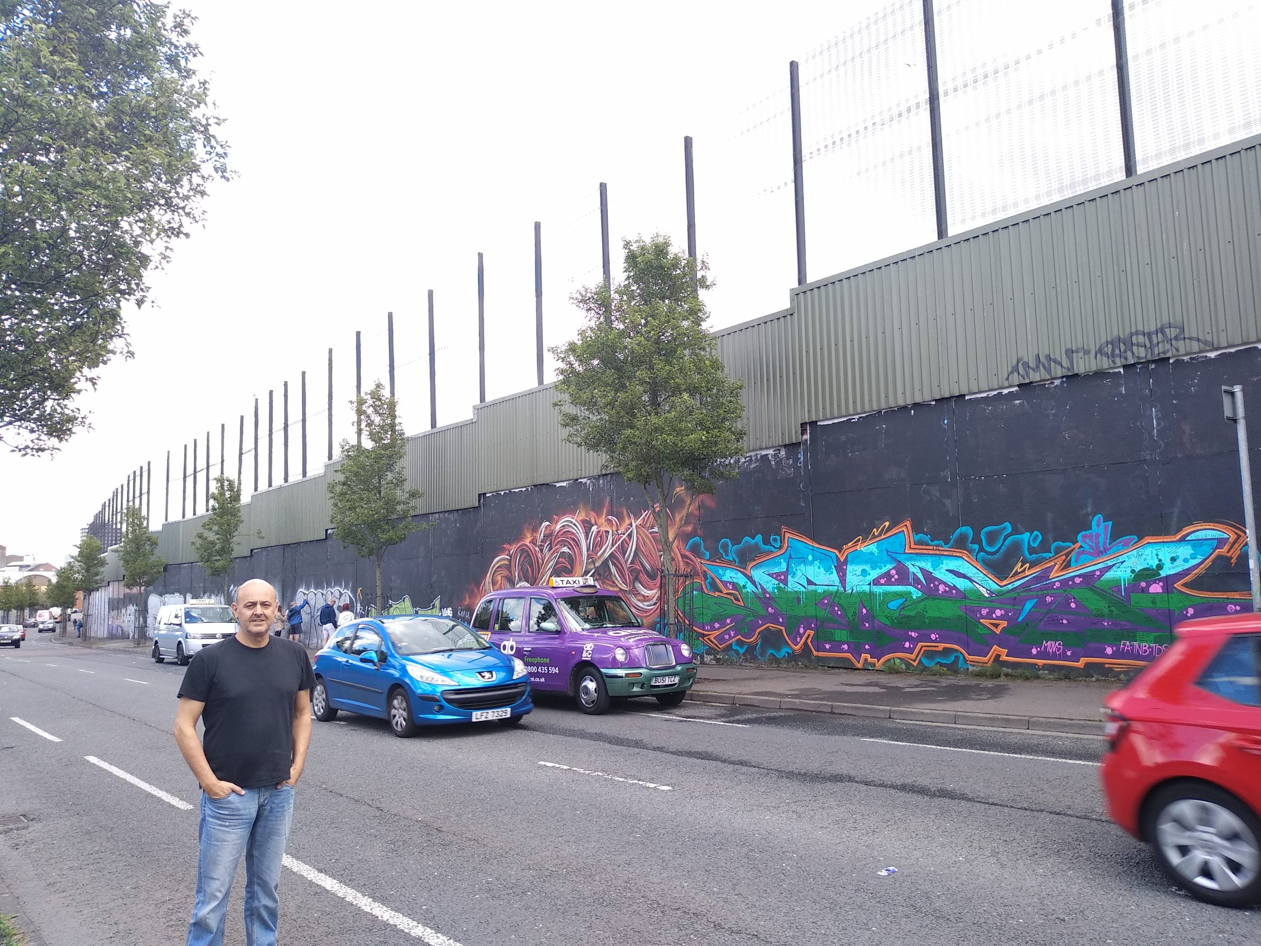 De paso a la Calzada de los Gigantes paramos a comer en Belfast, fuimos directo al muro de la paz, que es el muro que se construyó para separar la zona católica de la protestante, pues se lanzaban cocteles molotov de un bario a otro. En su momento se cerraban la puertas de comunicación de un barrio con otro. Actualmente es un lugar turístico al que la gente acude a ver las pintadas del muro y hacerse fotos.
